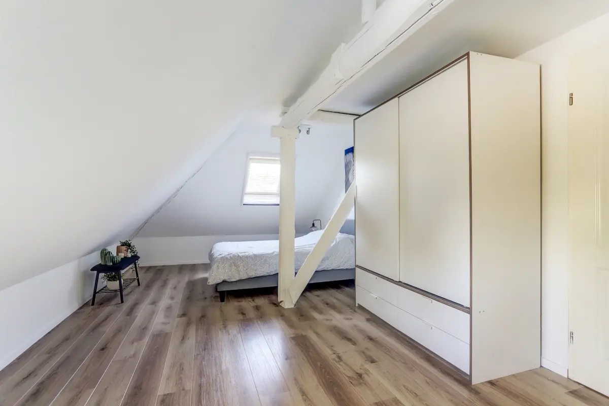 Via een vaste trap bereikt u de tweede verdieping, en wat u daar aantreft zal u positief verrassen. Deze etage strekt zich uit over de volledige lengte van het huis en biedt een zee aan mogelijkheden. De ruimte is hoog genoeg om prettig in te bewegen en is momenteel in gebruik als sfeervolle slaapkamer met een rustige werkplek — maar leent zich net zo goed voor een atelier, chillruimte of extra logeerkamer.
