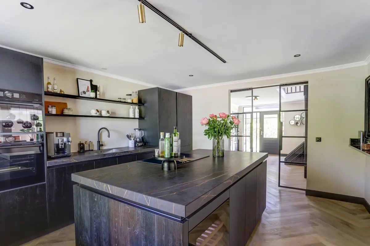 De keuken is in 2022 volledig vernieuwd en het resultaat mag er zijn: een luxueuze, greeploze opstelling in zwart hout met een kookeiland als kloppend hart. De donkere keramieken werkbladen zijn niet alleen een lust voor het oog, maar ook praktisch in gebruik. Ingebouwde wijnklimaatkast? Natuurlijk. Hoogwaardige inbouwapparatuur? Aanwezig. Open wandplanken en subtiele verlichting maken het geheel compleet. Deze keuken ademt design, zonder in te leveren op gebruiksgemak. Koken, borrelen, keuvelen – alles gebeurt hier in stijl.